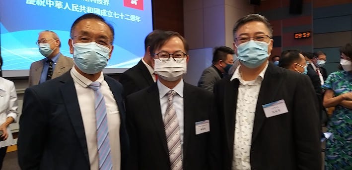 財政司司長 - 陳茂波先生致辭WFA聯合創辦人Peter So(左一)表示:很高興在【香港科技界慶祝國慶研討會】碰到友好鍾偉強副局長(創新科技局) 及 Torin會長(香港科技協進會),期望有機會與WFA會員分享創科政策及大灣區落地經驗。