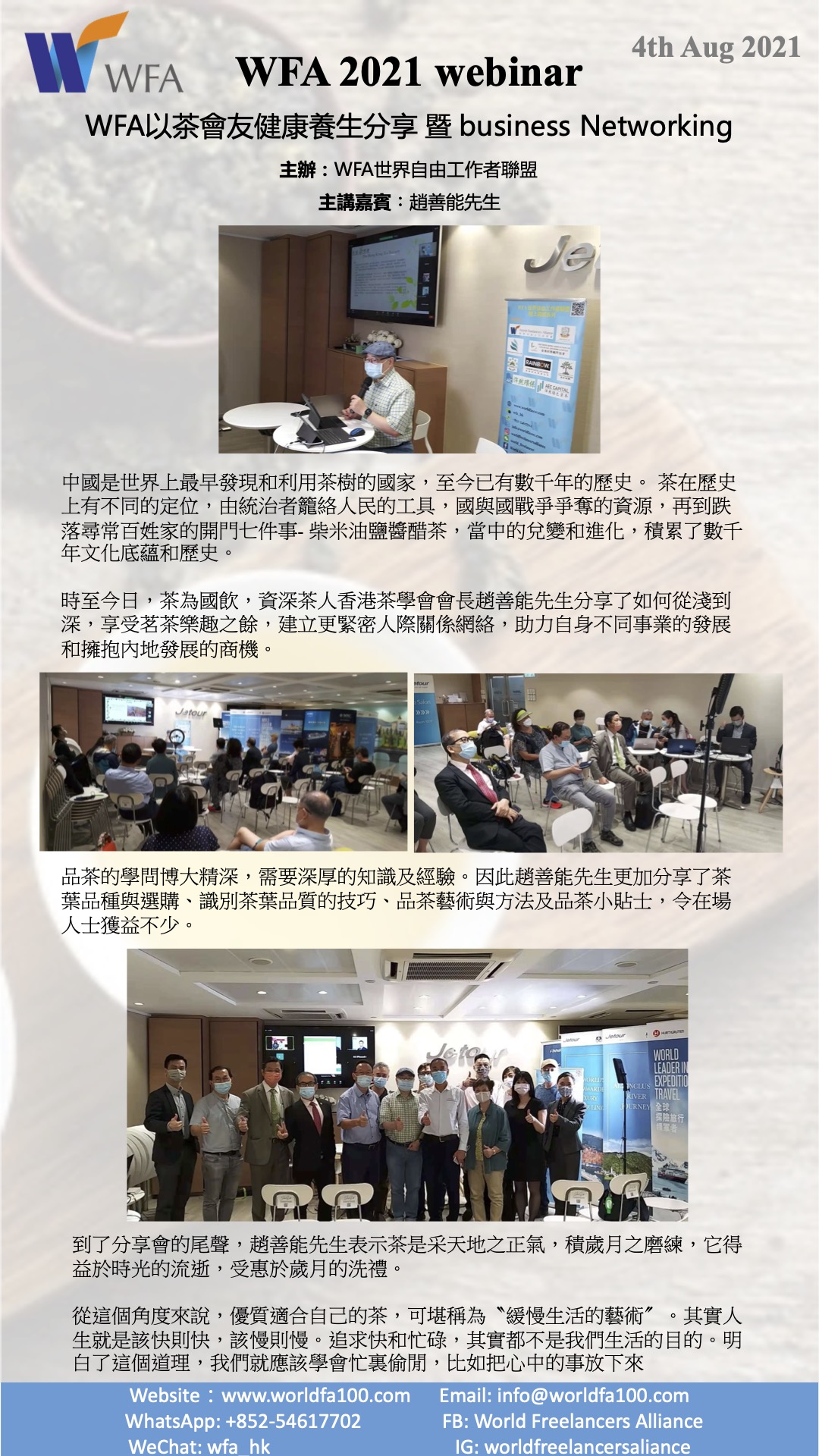 座談會內容大綱:古今中外,茶在歷史上有不同的定位,由統治者籠絡人民的工具,國與國戰爭爭奪的資源,再到跌落尋常百姓家的開門七件事- 柴米油鹽醬醋茶,當中的兌變和進化,積累了數千年文化底蘊和歷史。時至今日,茶為國飲,我們如何擁抱新一波社交禮儀,資深茶人香港茶學會會長趙善能先生將和您分享如何從淺到深,享受茗茶樂趣之餘,建立更緊密人際關係網絡,助力自身不同事業的發展和擁抱內地發展的商機。