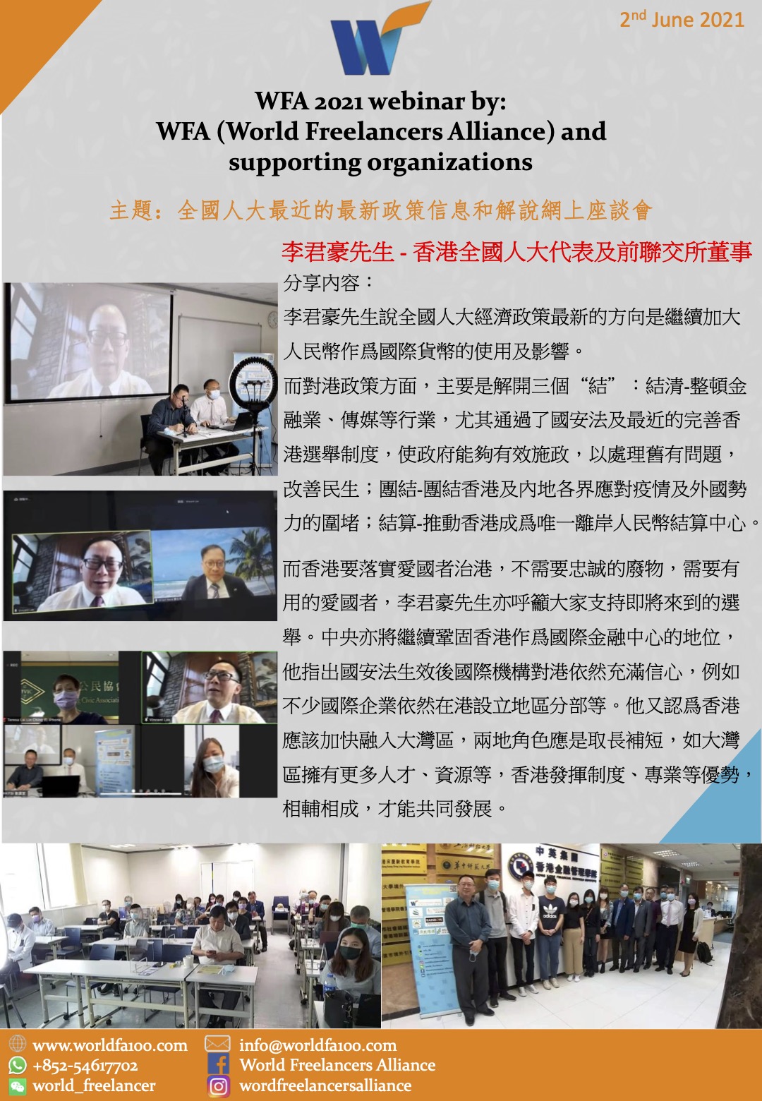 WFA於2021年6月2日舉辦講座主題:全國人大最近的最新政策信息和解說網上座談會