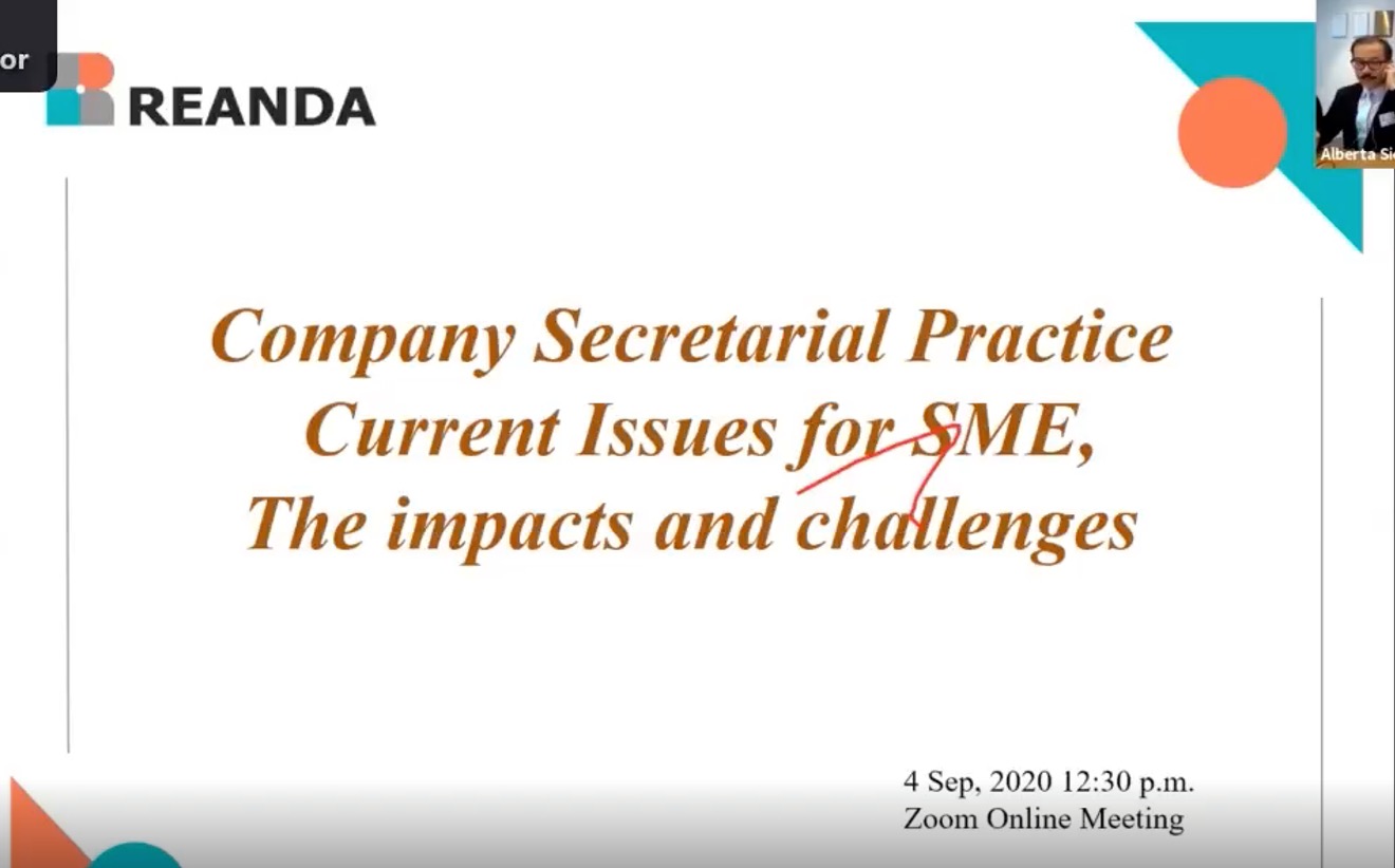 主講嘉賓: Ms. Alberta Sie, 資深英國及香港特許公司秘書公會會員及理事,LLB(北京大學)。現為Reanda EFA Secretarial Ltd 合伙人。擁有超過二十五年多的專業公司秘書, 專業團體理事,政府機構及大專院校顧問……等的專業經驗